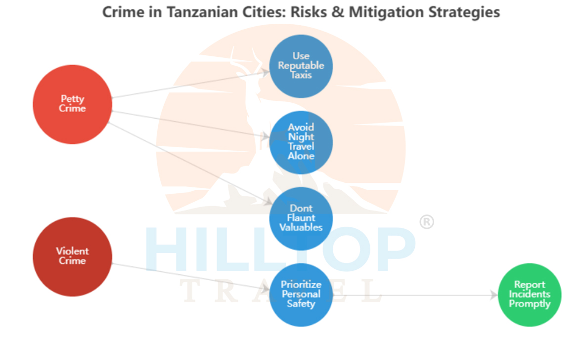 Like many popular tourist destinations, Tanzania’s cities experience petty crime such as pickpocketing and “snatch-and-grab” thefts. Visitors should remain alert, especially in crowded markets, bus terminals, or tourist hubs. Violent crime against tourists is less common, but muggings can occur, particularly at night in isolated areas. By taking basic precautions, you can significantly reduce your risk of becoming a victim. Below is a breakdown of common risks and the recommended precautions to mitigate them.